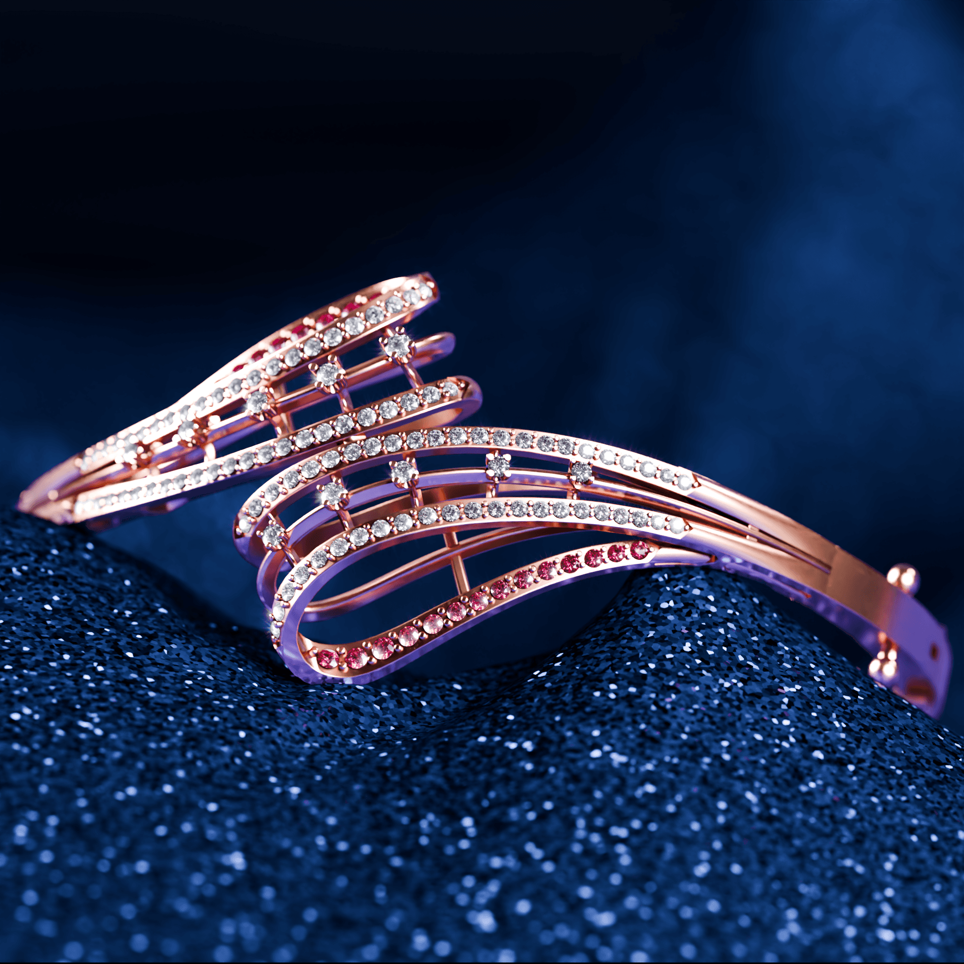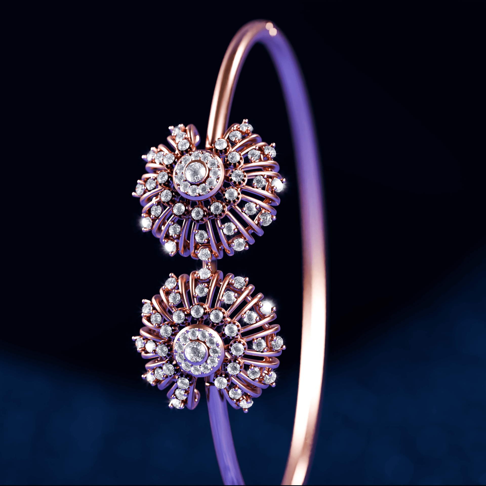 we transformed Tanishq’s exquisite craftsmanship into a high end 3D experience. By pairing intricate rose gold modeling with high dispersion diamond shaders against a deep, royal blue atmosphere, we emphasized elegance and detail. The result is a cinematic commercial that blends traditional jewelry artistry with digital aesthetics